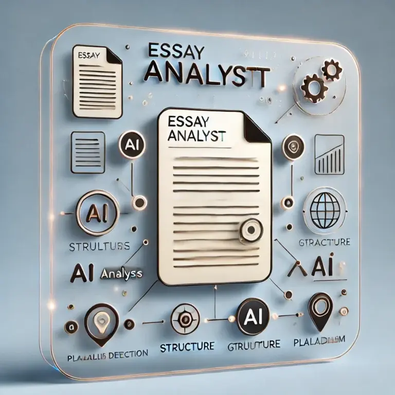 Essay Analyst es una plataforma impulsada por IA diseñada específicamente para ayudar a los estudiantes a mejorar sus ensayos académicos. Mediante el análisis de la estructura, el contenido y el estilo de la escritura, esta herramienta proporciona retroalimentación inmediata y recomendaciones personalizadas que ayudan a los usuarios a perfeccionar su trabajo antes de la entrega.